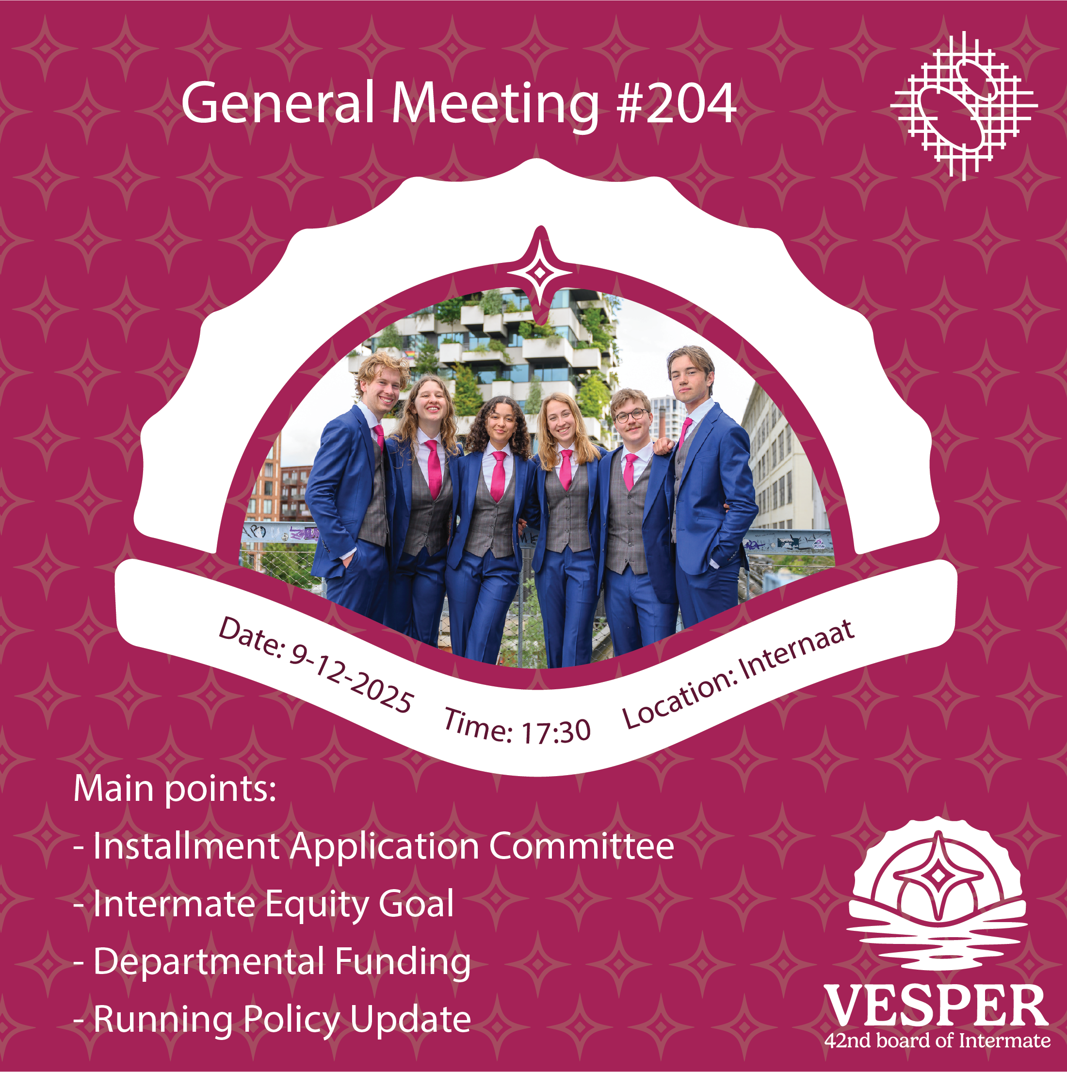 On Tuesday the 9th of Dece,ber, General Meeting #204 of study association Intermate will take place. The GM will start at 18:30 in the Internaat with free dinner being served at 17:30.