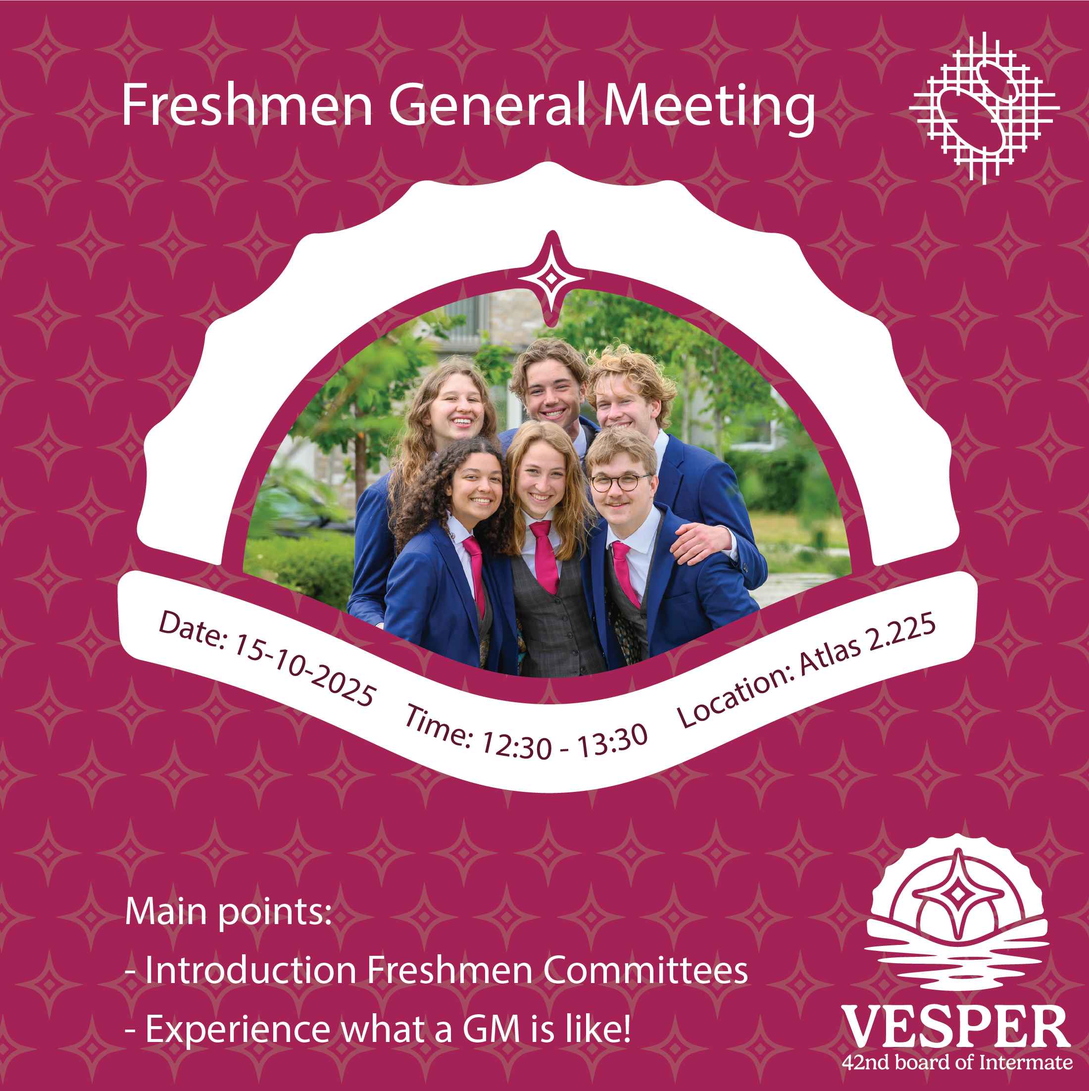 Hey lovely freshmen! Hopefully you've grown a bit accustomed to the rhythm at Intermate 💛: the borrels, the committees, and our activities. To show you what a General Meeting is like, we've organized the Freshmen GM on the 15th of October from 12:30 to 13:30 with free lunch!