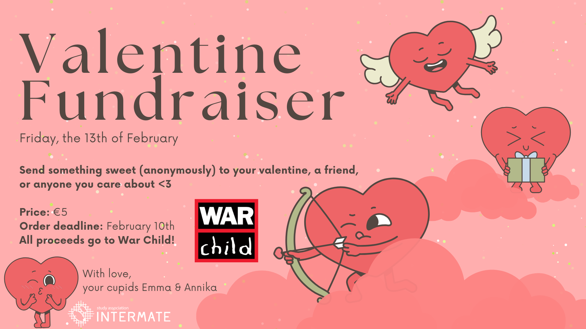 This valentine, we are back to spread some love! ❤️ For your crush, friends, committee members, or even a random stranger, we have the perfect gift! You can send them some delicious Valentines day themed sweets (chocolate hearts, heart candy) with a personal message 💌 to make them feel extra loved this valentine. All the profits made will go to War Child, a good cause which helps children in warzones to gain confidence, happiness, and resilience.