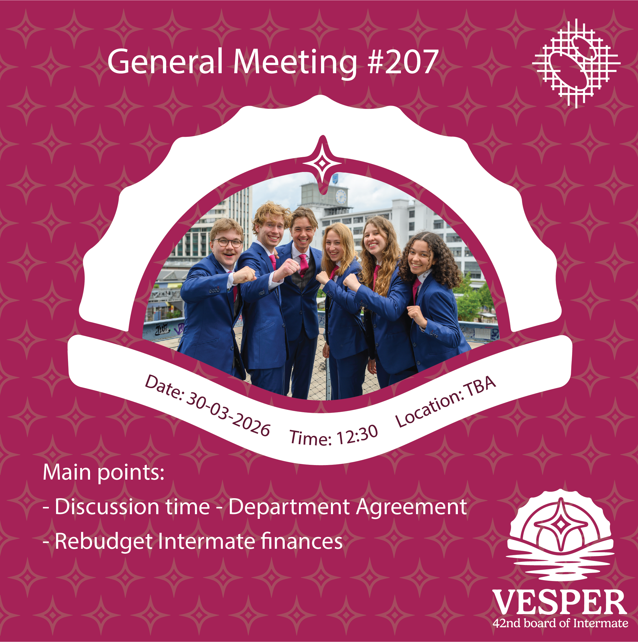 On Monday the 30th of March, General Meeting #207 of study association Intermate will take place. This short extra GM was planned since there was no time last GM to cover all topics, so we will be discussing these topics during this lunch GM.