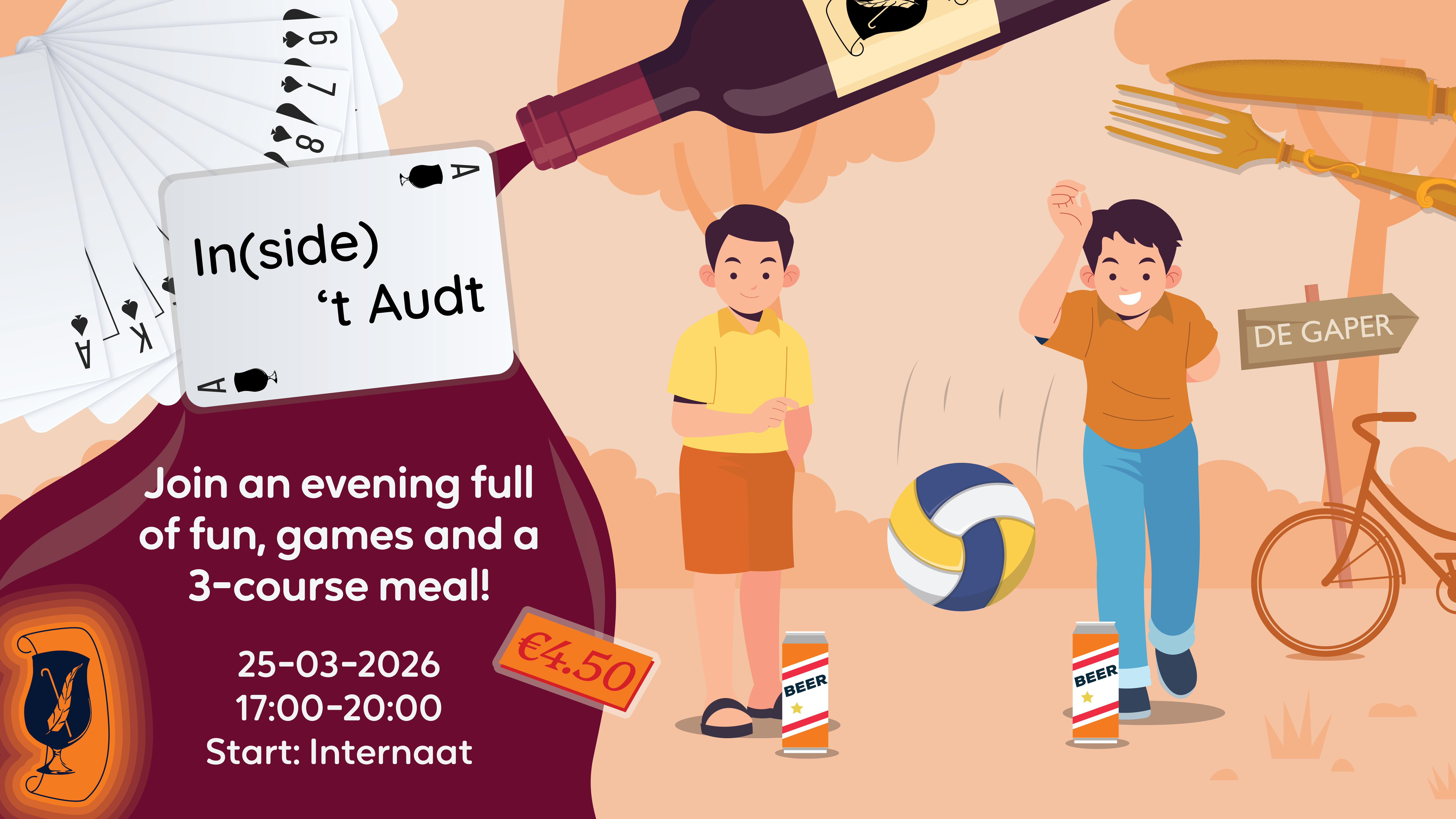 Mark the 25th of March in your calendar 17:00-22:00🗓️ for another edition of the In 't Audt open activity: In(side) 't Audt🧡! This time, presenting something other than "happen, tappen, trappen"🙅♂️🙅♂️, join us for a three-course dinner🥘🤩 in the Internaat, tense matches of flunky-/volleyball🏐🍺, and a drink in our favourite brown cafe: the Gaper🍻; with games and drinks throughout the evening.