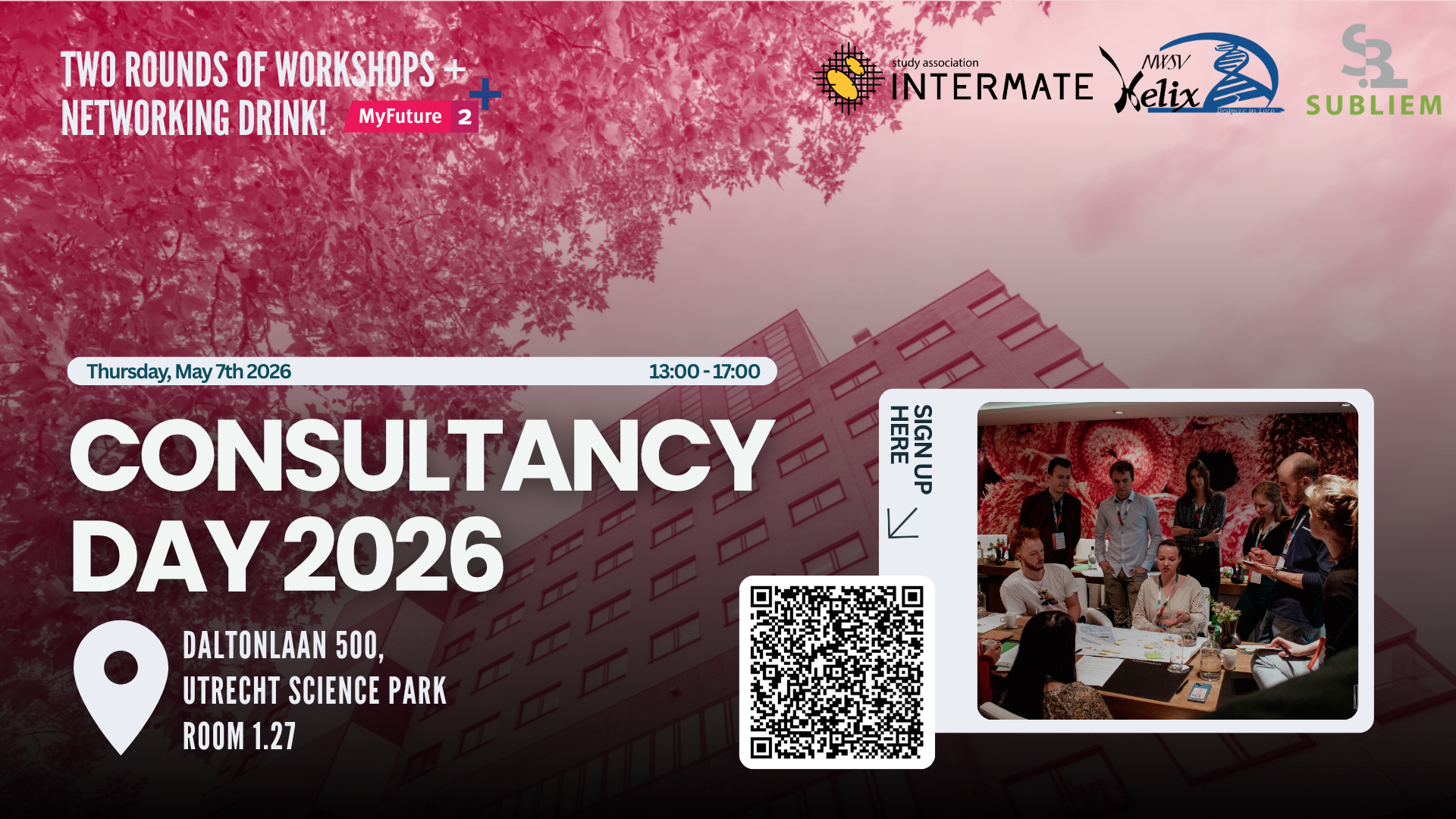 The Consultancy Day is a career-focused event centered around interactive workshops and real-life business cases, followed by a networking drink. The event is co-organized with SV Helix (the student association for Innovation Management and Science at Utrecht University) and S.A. Subliem (the study association for students of Science, Business & Innovation).