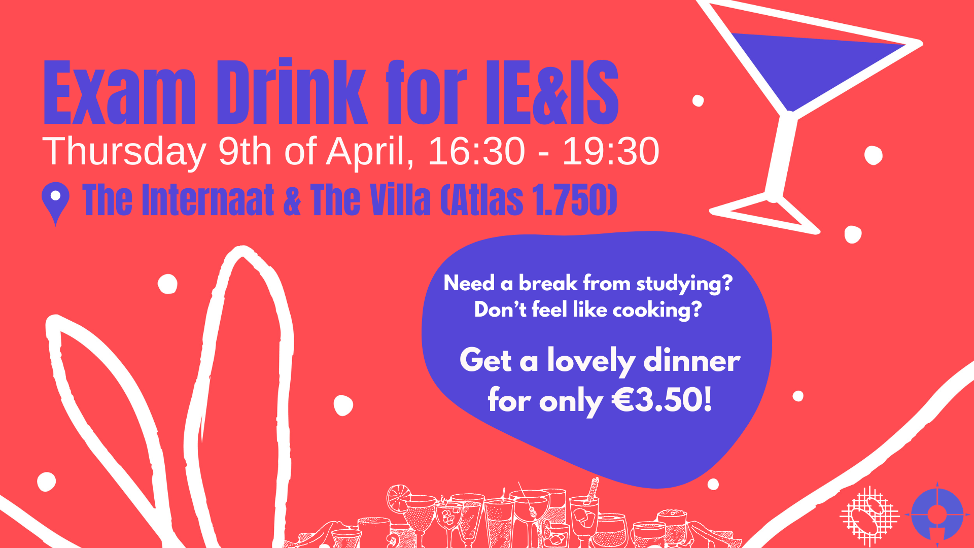 Come join us at the very first Exam Drink on Thursday, April 9th from 16:30 - 19:30 and enjoy a warm, affordable dinner for just €3.50!! 💸 During the first week of exams, we’re bringing everyone together: students and staff from the entire IE&IS department, for a relaxed evening to recharge⚡and connect. 🤝